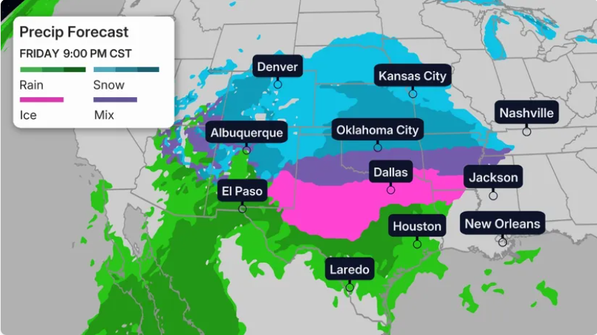 - Texas & Louisiana: Freezing rain